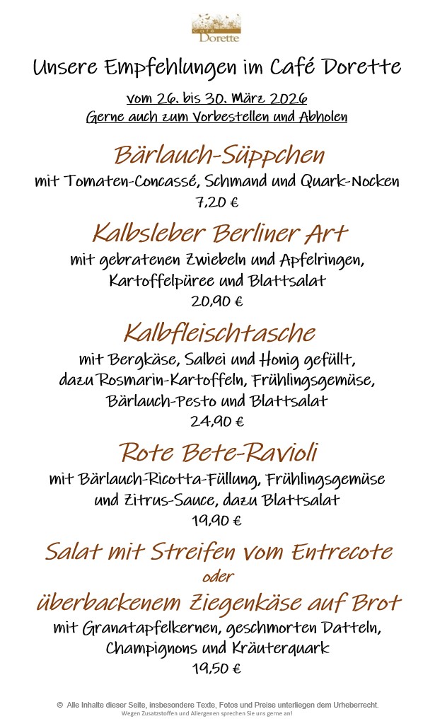 Tagesempfehlungen, Kaffeespezialitäten, selbstgemachten Torten